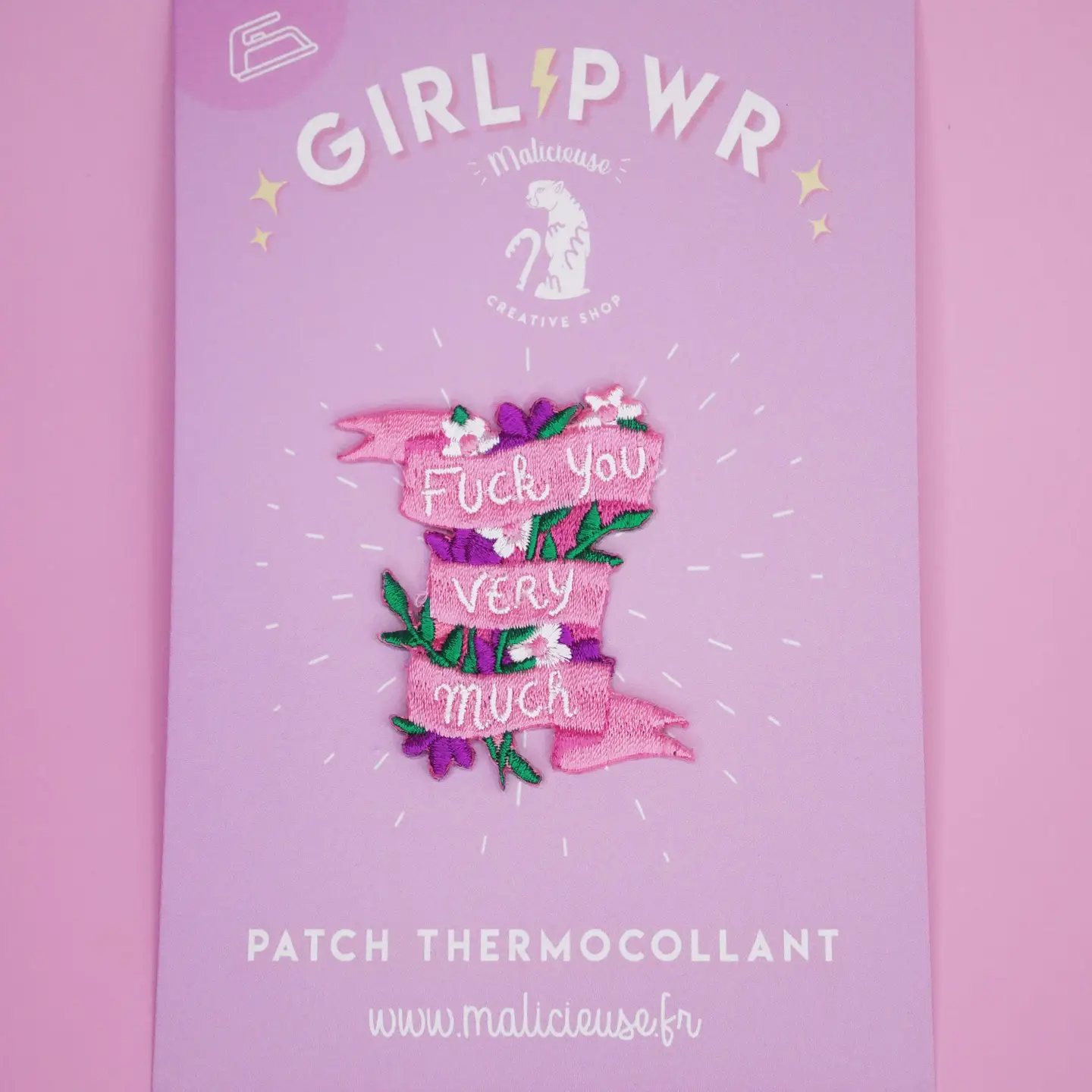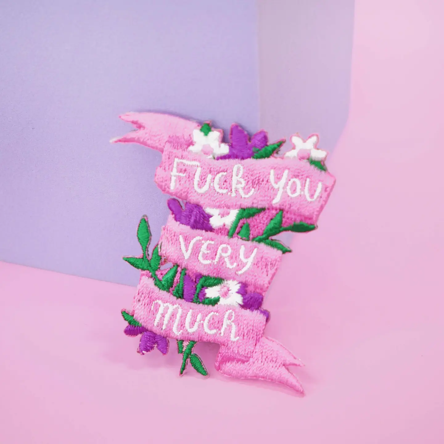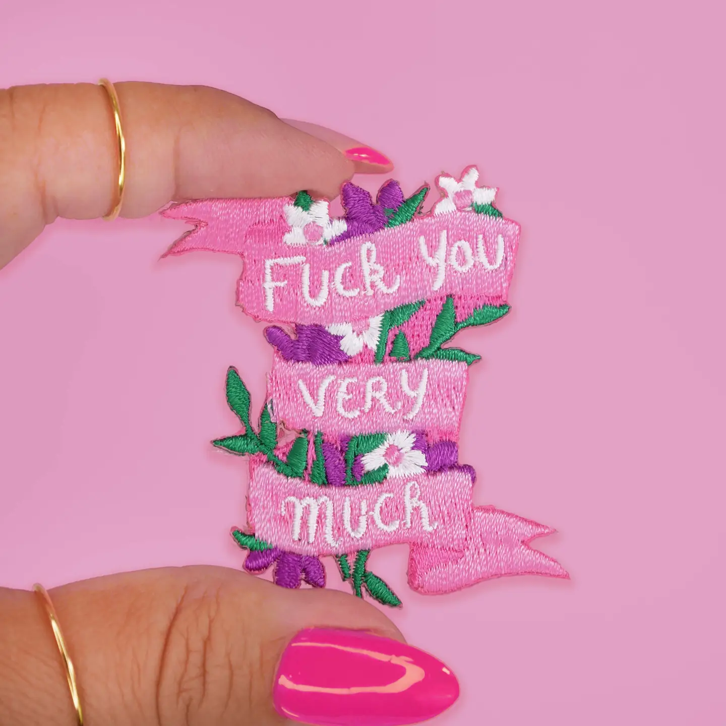 Manchmal braucht es klare Worte in hübscher Stickerei. Setze mit dem Bügel-Patch „F*ck you very much“ ein Statement in rosa Design. Für alle, die Haltung zeigen wollen – mit Stil und einem Augenzwinkern.