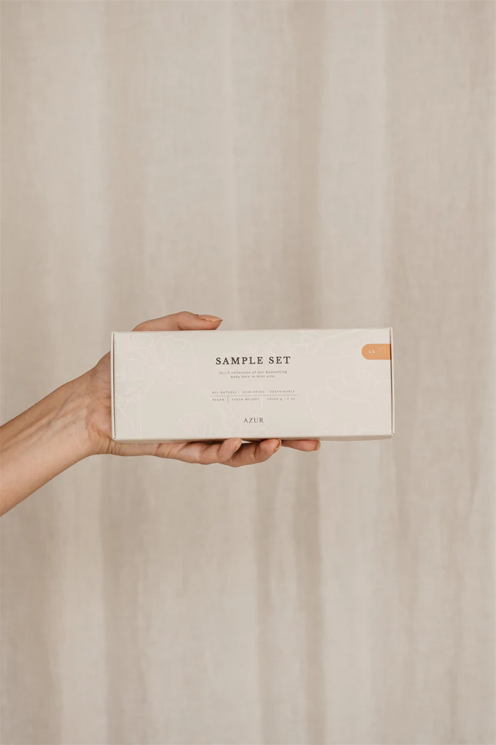 Das Seifen-Set „Sample Set“ von Azur Natural Bodycare enthält gleich 4 Lieblingsdüfte in idealer Kennenlerngröße à 50g. Die Bodybars werden in einer traditionellen Seifenfabrik in Groningen in den Niederlanden hergestellt. Sie enthalten 100% natürliche Inhaltsstoffe, die die Haut pflegen und hydratisieren. Auch für empfindliche Haut geeignet.